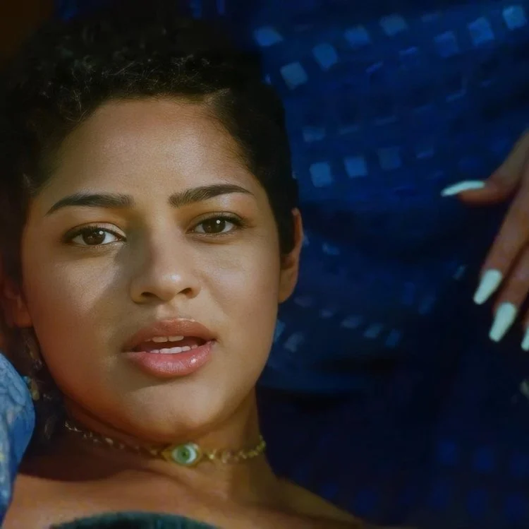 Close-up of a woman with short black hair, wearing light makeup, a gold necklace, and a blue patterned top, lying down and looking at the camera.
