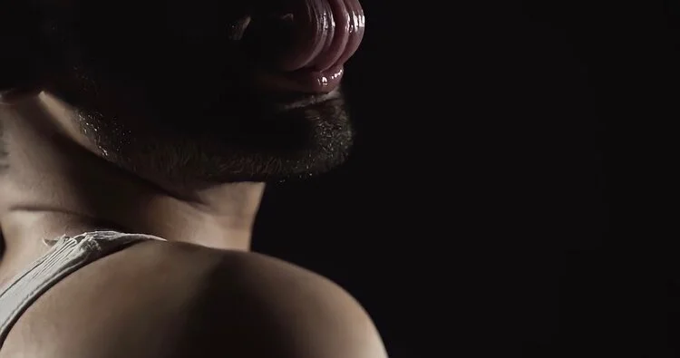 Close-up of a person's face and shoulder, with only the lower part of the face visible, set against a dark background.