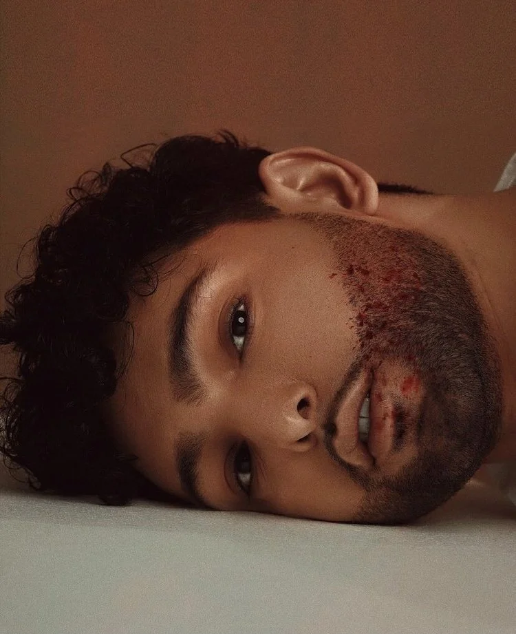 A young man with curly dark hair and a beard lies on his side with a bruised face and visible injuries around his mouth.