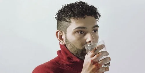 A person with curly hair and a beard wearing a red sweater, holding a glass of water and drinking from it.