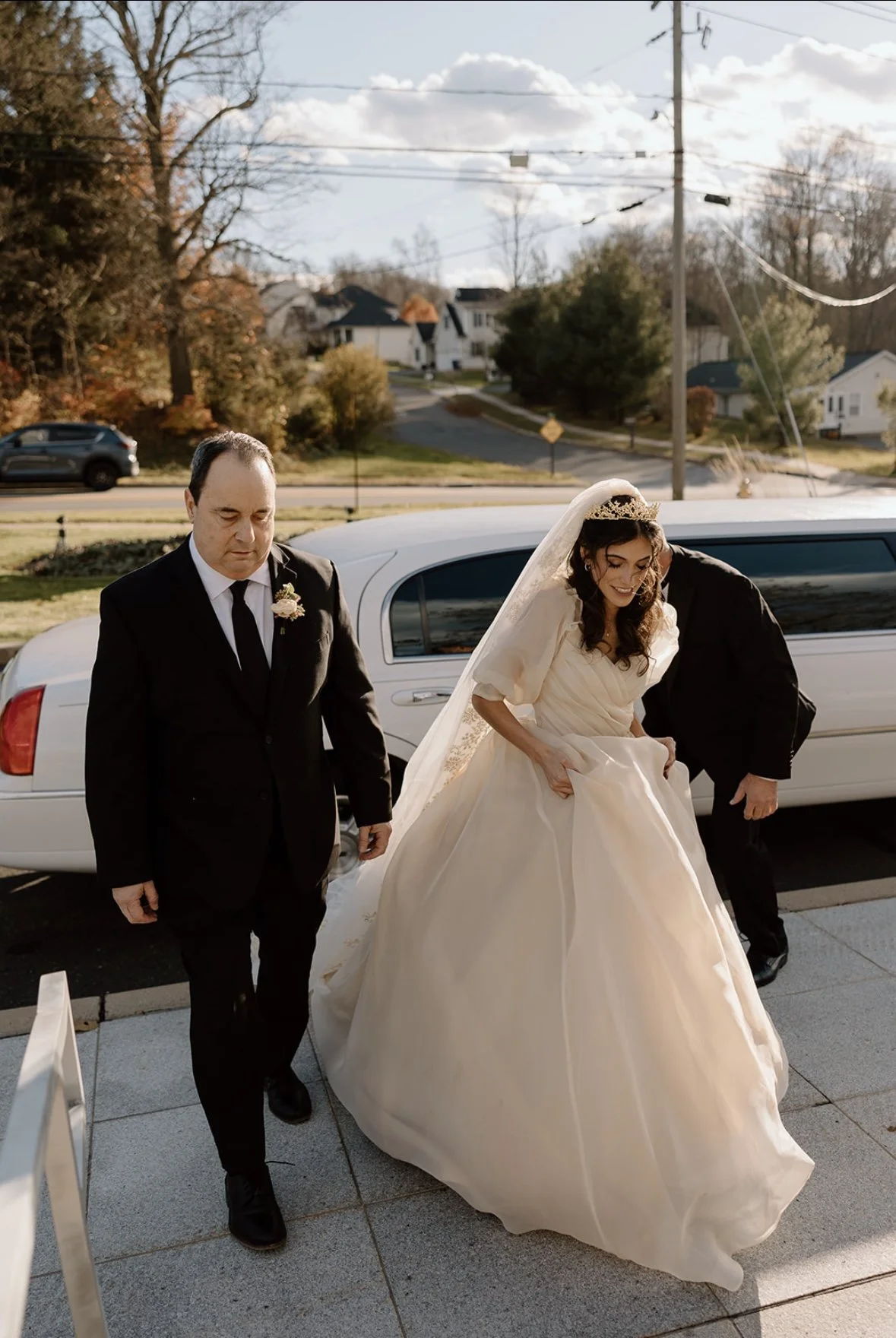 A bride in a white wedding dress and veil walking with two men in black suits outside a church, with a white limo and suburban neighborhood in the background.